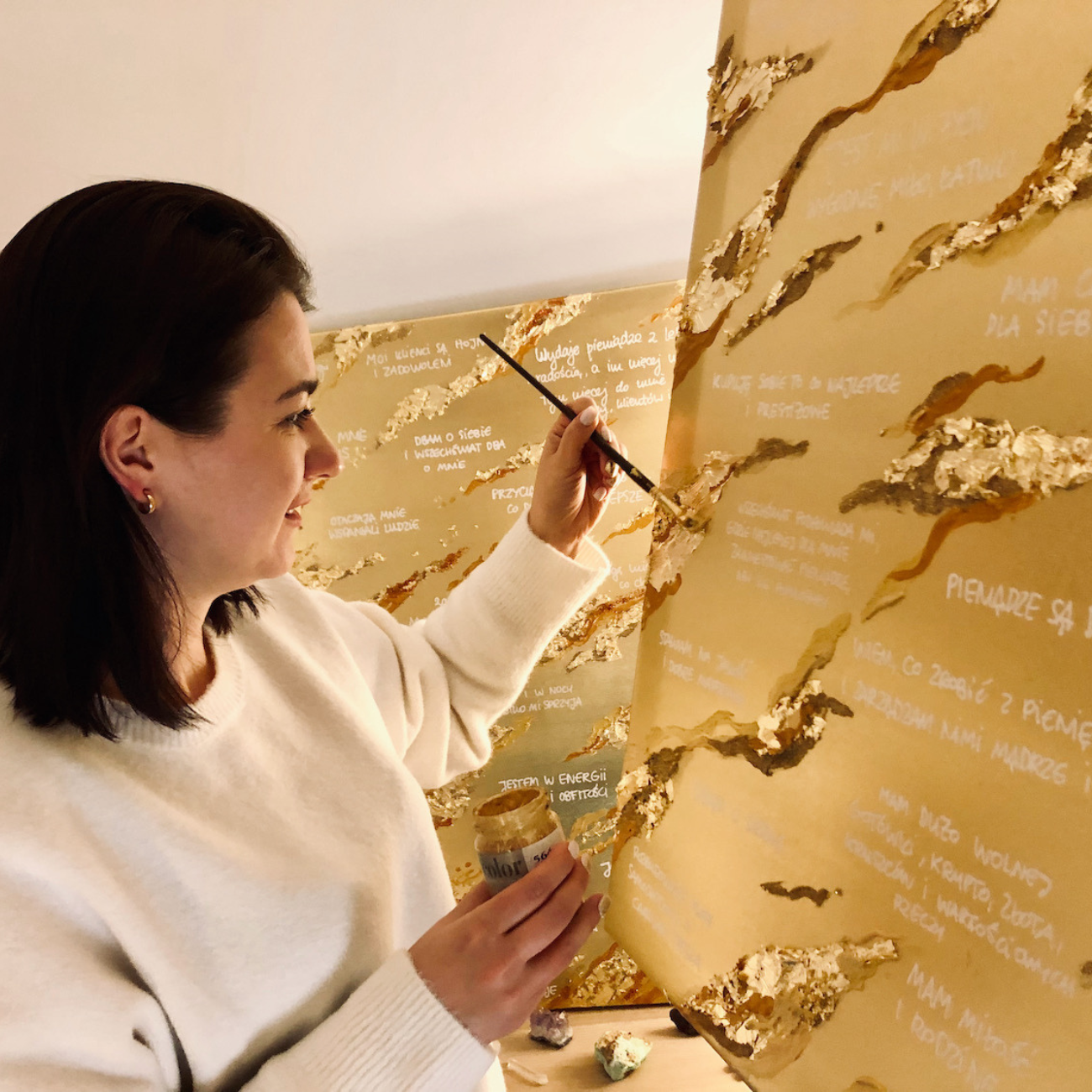 Obraz malowany jest na złotym płótnie, spacjalnie dla Ciebie, wzmocniony kilkoma rodzajami “złota” 😄💎✨ naciągnięty na krosno, gotowy do powieszenia we wspierającym Cię miejscu.